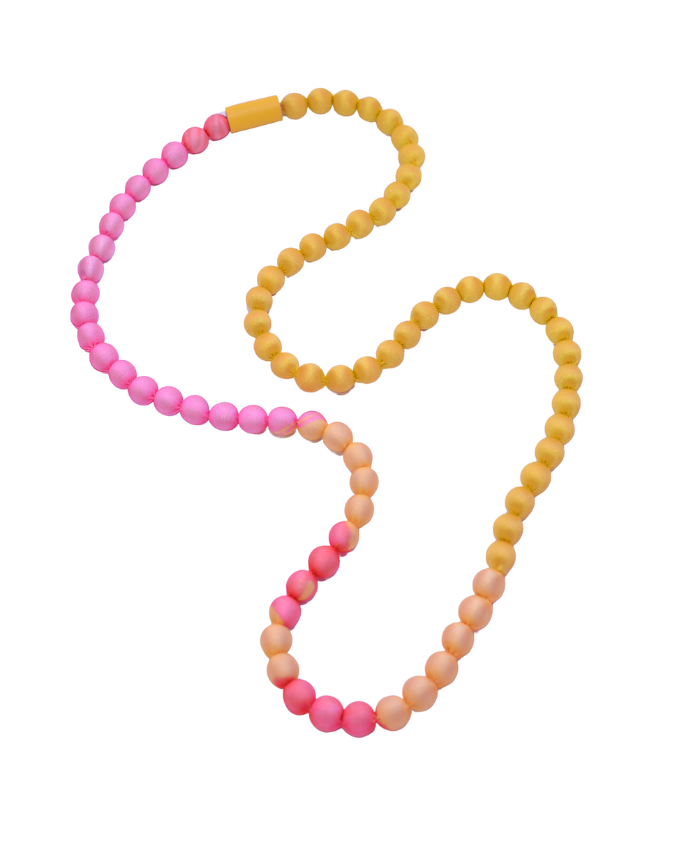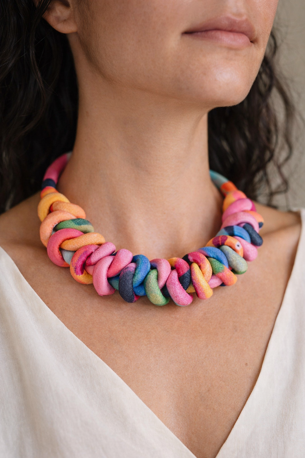 Cada collar nace a partir de retazos de telas provenientes de obras de Aranxazu Llorente. Fragmentos que alguna vez formaron parte de una imagen mayor y que hoy se resignifican a través del gesto manual. En manos de FA! fa studio, estos restos se forran, trenzan y ensamblan minuciosamente, respetando la materia, el color y el ritmo propio del trabajo artesanal.
